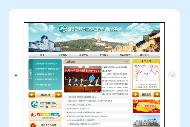 北京市郊区旅游实业开发公司(简称北京郊旅公司),经北京市人民政府批准(京政办发[1985]26号),于1985年2月13日成立。伴随着改革开放的时代潮流,公司从小到大,从弱到强,发展成为以商贸、旅游为主业的大型国有企业,所属北京城乡贸易中心股份有限公司、北京城乡旅游汽车出租有限责任公司、北京新华国际旅游有限公司、北京城贸物业管理有限责任公司、深圳市京鹏实业有限公司等控股、参股二级子公司5个,三级子公司11个。
