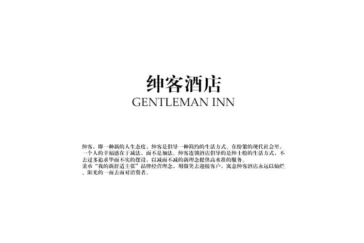 “我的新舒适主义” 拒绝奢侈,讲究舒适。绅客酒店的房间,让疲惫的身心以家的温馨,简约别致的细节更添旅途的乐趣,让你倍享绅士文化的魅力。在品牌创建方面,奇璐发挥了核心服务——设计团队的力量,标志以“Gentleman绅士”的“G”作为创作元素,形象的把绅士的特有“礼帽”进行了艺术创作。帽子、夜空、房屋形象的呈现于眼前,象征着夜幕降临后于此酒店下榻,简单的入住手续,简约温馨的房间设计,一切都是为您精心准备,有种受宠若惊的感觉。